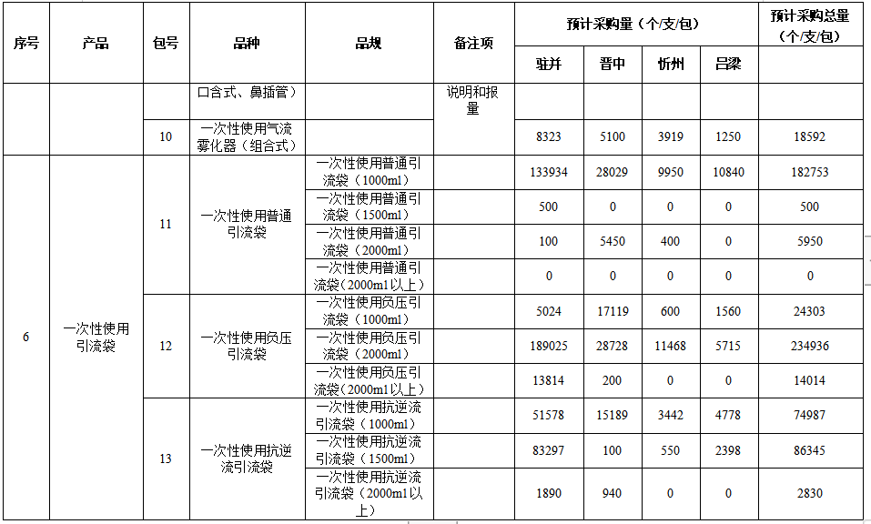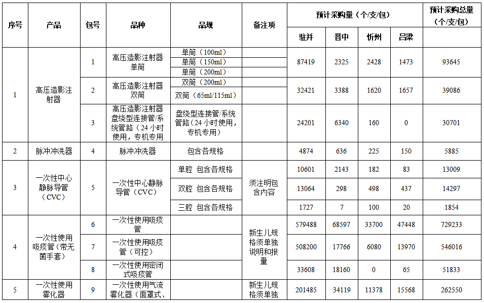 本次集中谈判议价采购的耗材有六类,分为13个采购包,包括:高压造影注射器、脉冲冲洗器、一次性中心静脉导管(CVC)、一次性使用吸痰管(带无菌手套)、一次性使用雾化器、一次性使用引流袋。