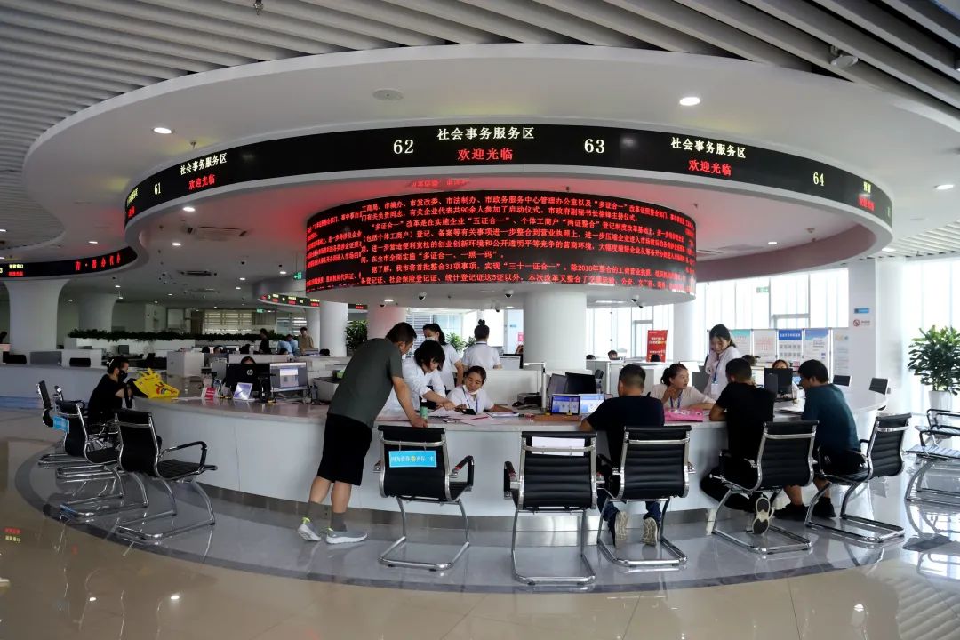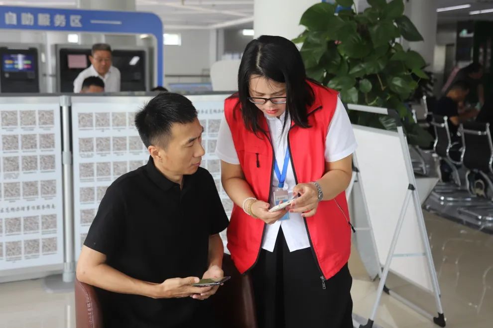 在济宁高新区为民服务中心办事大厅,工作人员正在给前来办理宽带接入业务的黑马智造(山东)数字技术有限公司法定代表人介绍电子营业执照小程序“济宁专区”相关业务功能。