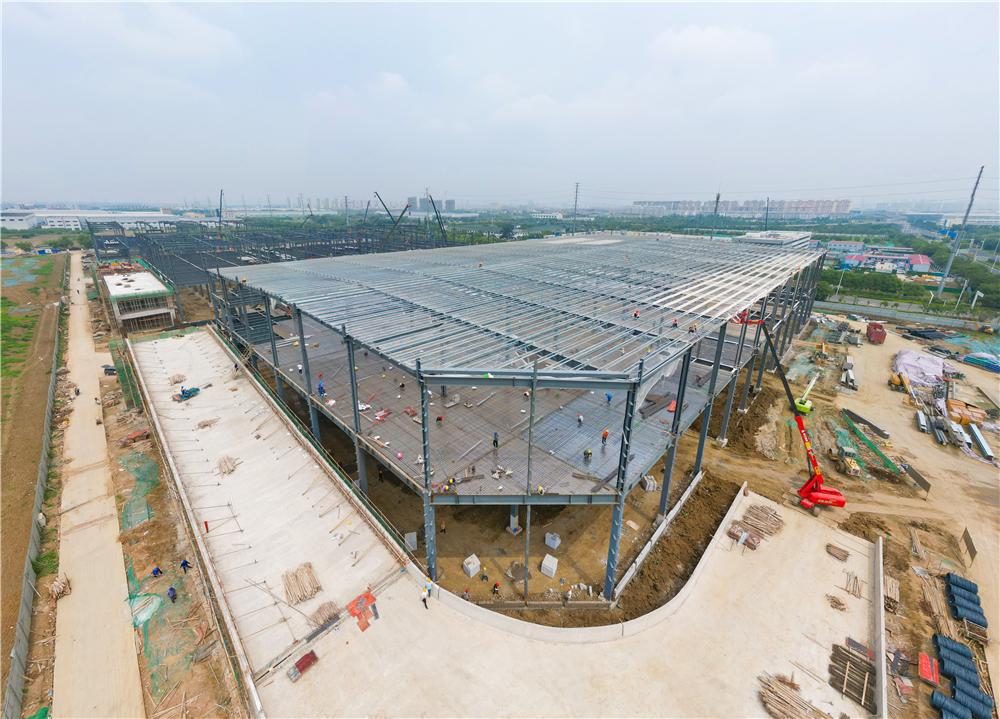 该项目总建筑面积约11万平方米,主要建设新能源汽车零部件智能供应链服务中心。目前,施工现场处于主体钢结构吊装阶段,已初见雏形,预计2024年一季度完工。建成后,将为常州市建设新能源之都及长三角现代物流中心做出有力支撑。