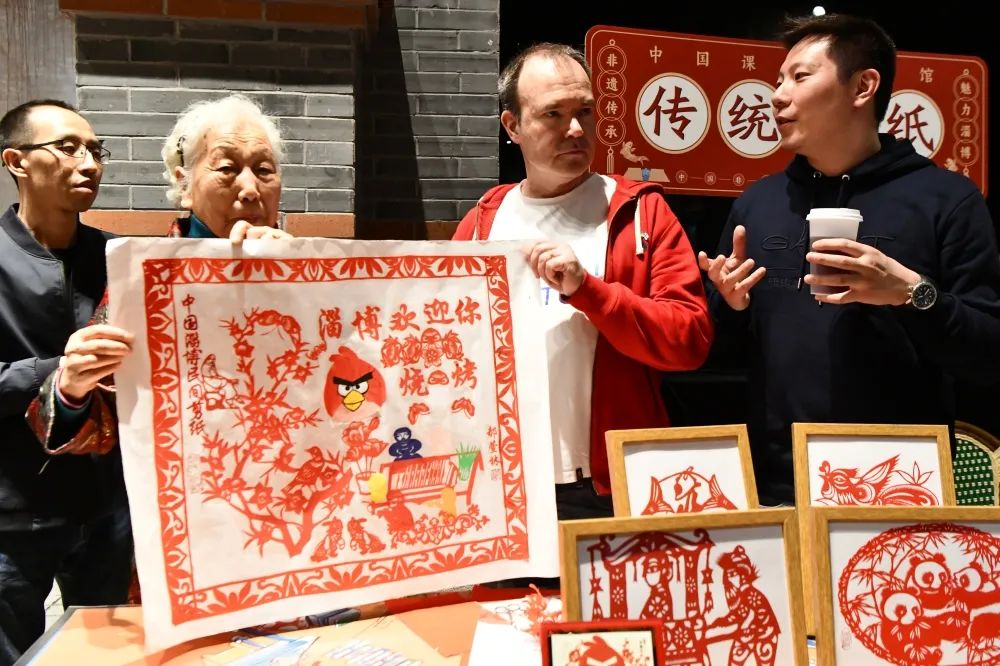 “外国友人到我们这里来,我们要把最好的祝福送给他们,也让他们带回我们中国的传统剪纸,把民间剪纸传承到国外去。”淄博市非物质遗产项目代表传承人郝萱林向皮特·韦斯特巴卡团队送上了以“愤怒的小鸟”为题材的剪纸作品。