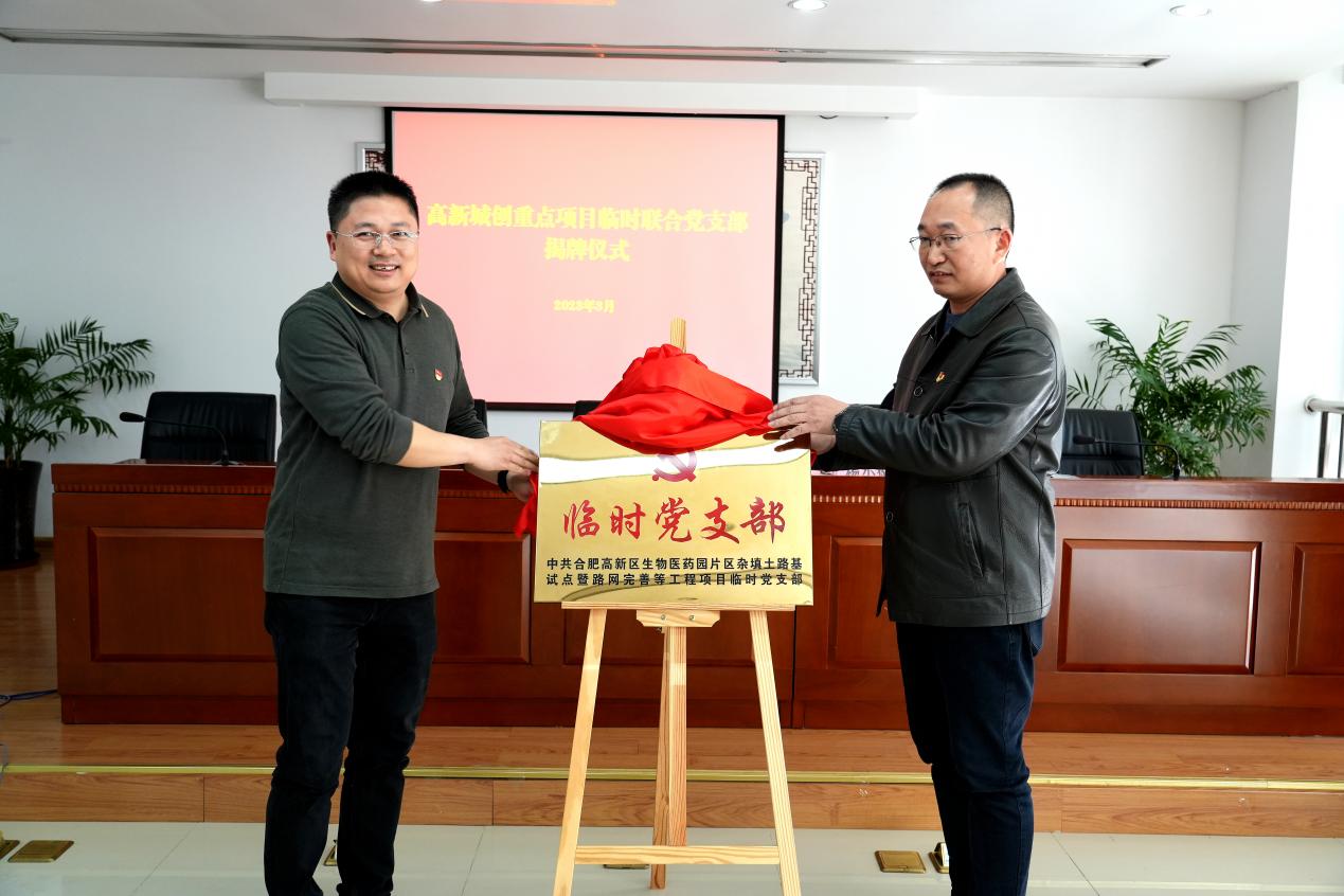 此次重点项目临时党支部揭牌仪式由合肥高新区重点工程管理中心牵头,成立了桂花园学校紫园校区改扩建与再生资源基地分拣中心完善工程项目党支部、高新区生物医药园片区杂填土路基试点暨路网完善工程项目党支部2个临时党支部,共50余名党员代表参加揭牌仪式。