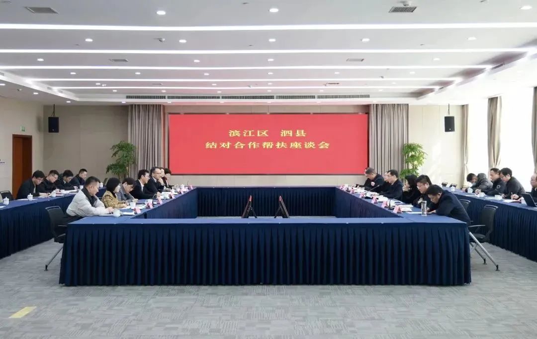 章登峰向泗县一行的到来表示欢迎。他表示,结对合作以来,杭州高新区(滨江)与泗县在选派干部挂职、助力产销对接、共享改革经验、开展劳务交流等方面精准对接、积极协作,取得了实质性进展和阶段性成效。要认真贯彻落实中共中央、国务院关于做好2023年全面推进乡村振兴重点工作的意见,准确把握新时代结对帮扶的目标要求和重点任务,进一步强化战略互信,扛起政治责任,为构筑泗县高质量发展新格局融入高新元素、作出滨江贡献。要立足“滨江所能”、着眼“泗县所需”,进一步拓展合作领域,推进两地实现全方位、宽领域、深层次的产业交流,为泗县发展注入更多创新动能。要坚持政府引导、市场运作、企业主体、社会参与、成果共享的基本路径,进一步浓厚协作氛围,健全两地互访交流和工作协同机制,念好共富经、打好产业牌,全力推动两地合作向纵深发展,携手打造结对合作帮扶典范,助力长三角更高质量一体化发展。