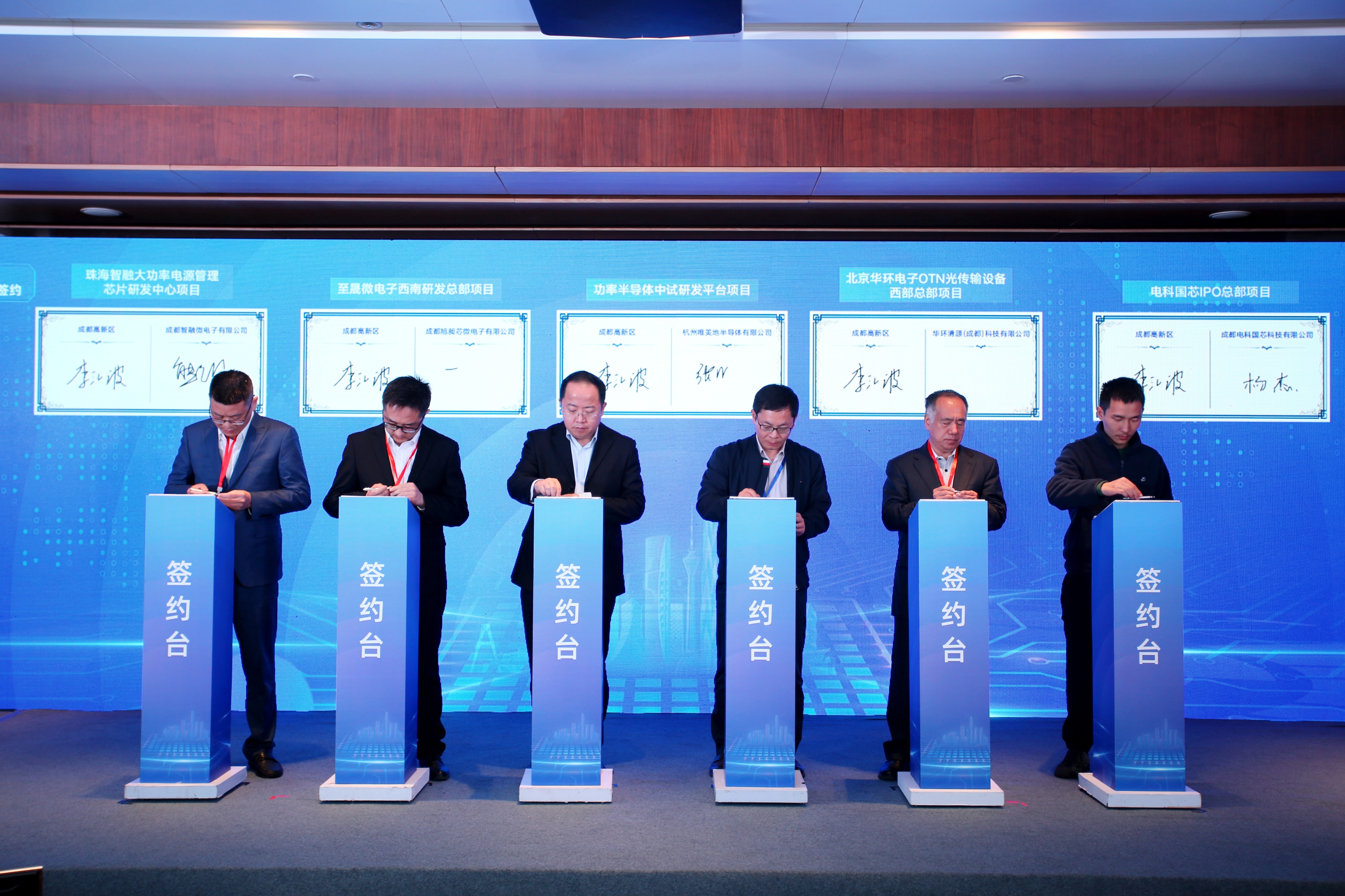 发布会现场,功率半导体中试研发平台项目、珠海智融大功率电源管理芯片研发中心项目、电科国芯IPO总部项目、北京华环电子OTN光传输设备西部总部项目、至晟微电子西南研发总部项目等5个高能级项目集中签约落户成都高新区,投资总规模22亿元。