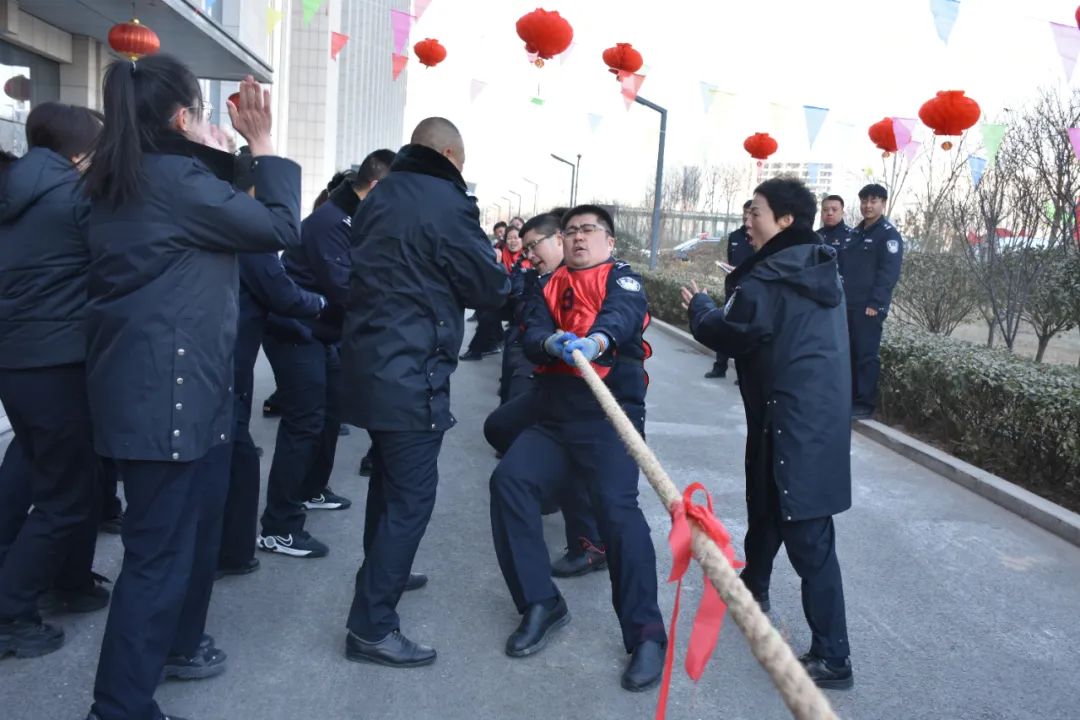 红红的灯笼高高挂起,五颜六色的彩旗风中飘起,尽管天气寒冷,但综改公安分局的民辅警们参与活动的热度不减。“加油!加油……”伴随着不断的呐喊声,综改公安分局拔河比赛异常激烈,双方队员紧握绳子,鼓足了劲、涨红了脸,将比赛推向了高潮。与此同时,还开展了象棋、踢毽子、跳绳等活动。