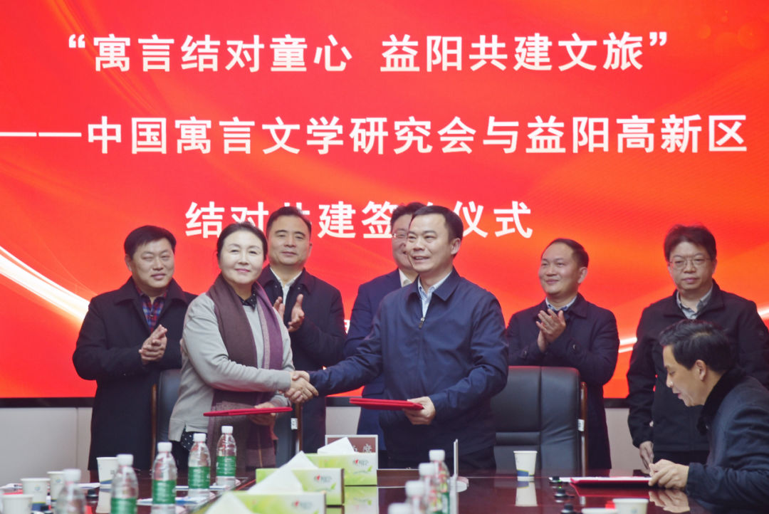 会后,还举行了“寓言结对童心 益阳共建文旅”中国寓言文学研究会与益阳高新区结对共建签约仪式。肖惊鸿、喻理科分别代表双方正式签约,刘益希主持签约仪式,李晓东、汪军、刘戈、李浏清、谢乐军、包后勇等领导共同上台见证。双方将积极推进多项合作,开设文学专题讲座、建设中国寓言文学研究会儿童书屋、深入文学调研走访、开展寓言童话进校园活动、举办全国儿童文学类颁奖或赛事等,助力清溪村开创更具辨识度的新文化,努力将中国寓言以更为丰富、崭新的形式呈现在大众面前。