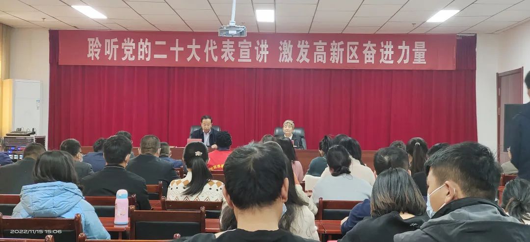 王兰花是“七一勋章”获得者、全国道德模范、全国“三八”红旗手标兵。她结合个人参会感受,用朴素的语言、生动的事例,从非常振奋、特别自豪、无比幸福、格外温暖四个方面分享了参加党的二十大盛会的所见所闻所感,宣讲党的二十大的意义、主题、主要成果,讲解党的二十大报告的基本框架。王兰花专题宣讲通俗易懂、朴素生动,对大家深刻理解和准确把握党的二十大精神有极大的启发。与会同志认真聆听,纷纷表示将继续深入学习领会党的二十大精神,学深悟透党的二十大的丰富内涵和精神实质,聚焦党的二十大擘画的宏伟蓝图,踔厉奋发、勇毅前行,全力推动高新区高质量发展。