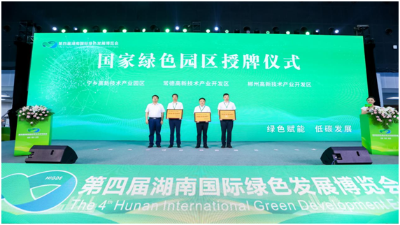 开幕式上,湖南省工业和信息化厅副厅长张治平为新晋升的国家级绿色工业园区授牌。自贸区郴州片区、郴州高新区党工委委员、副主任李富春上台领取郴州高新区国家级绿色工业园区牌匾。