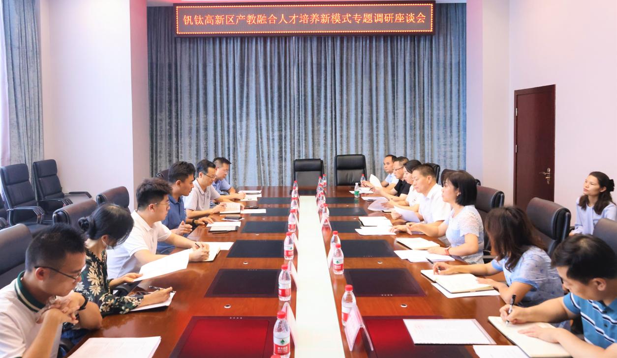 攀枝花市委组织部、市经济和信息化局、市发改委、市人力资源和社会保障局、攀枝花钒钛高新区管委会相关负责人和部分企业代表就进一步促进攀枝花市教育链、产业链、创新链有机衔接、深度融合,探索产教融合人才培养新模式进行了深入的交流和探讨,为人才兴攀、全力推动高新区钒钛产业转型升级发展建言献策。