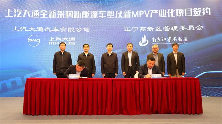 现场,在参加活动领导和嘉宾的见证下,南京高新区(江宁园)管委会与上汽大通公司签订上汽大通全新架构新能源车型及新MPV产业化项目落地协议。