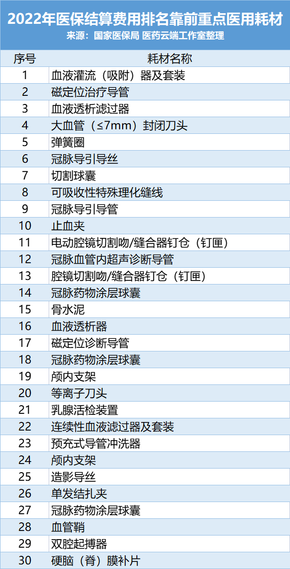 通知列举了医保结算费用靠前的90个药品、30个耗材名单。其中,耗材涉及11个心脏、血管介入手术耗材、8个手术器械、血透类耗材4个,另有神经外科及骨科耗材。