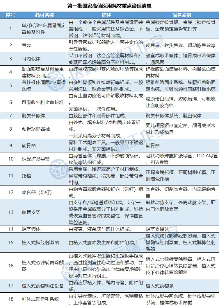 2019年5月29日,中央全面深化改革委员会第八次会议审议通过《治理高值医用耗材改革方案》,紧接着,国家卫生健康委办公厅印发《第一批国家高值医用耗材重点治理清单》,纳入18类医用耗材重点治理,要求各地在此基础上,根据各地实际,适当增加品种,形成省级清单,并指导辖区内医疗机构制定医疗机构清单。