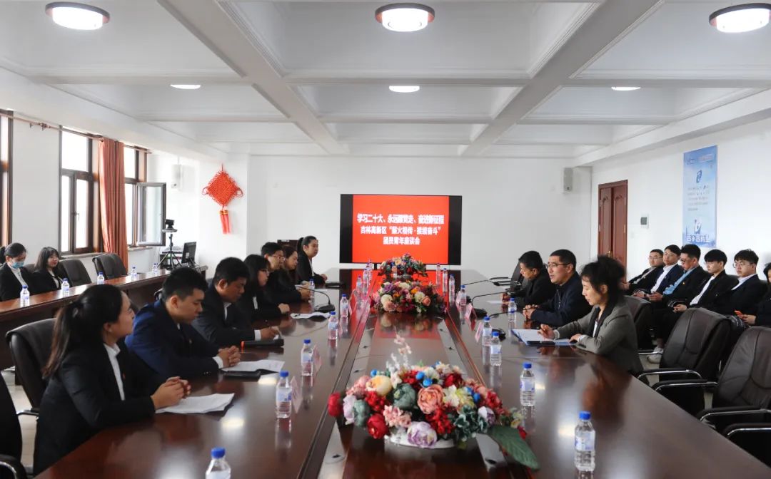 随后,与会人员召开“学习二十大、永远跟党走、奋进新征程”——吉林高新区“薪火相传•接续奋斗”团员青年座谈会。机关团员代表新北街道胡文浩宇,机关青年干部代表招商一局局长王子铭、科技局副局长赵毅,社区团支部书记代表恒厦社区刘素妍、颐馨社区赵诗佳、紫光社区宋振飞,非公企业青年干部吉林富晟车灯有限公司团委书记于程依次发言。大家围绕学习贯彻党的二十大精神,结合自身学习体会和工作实际,交流思想感悟。与会青年干部纷纷表示,作为新时代的高新青年,要争当有理想的青年。坚定理想信念,始终忠诚于党和人民,深刻领悟“两个确立”的决定性意义,增强“四个自信”,坚定“四个意识”,做到“两个维护”。践行初心、担当使命,把远大理想和脚踏实地结合起来、坚持埋头苦干,坚持人民立场,加强理论业务学习,提升狠抓落实的能力,把所学所获转化为干事创业的动力,围绕“南优北兴,又高又新”发展格局,为推动吉林高新区高质量发展贡献青春力量。