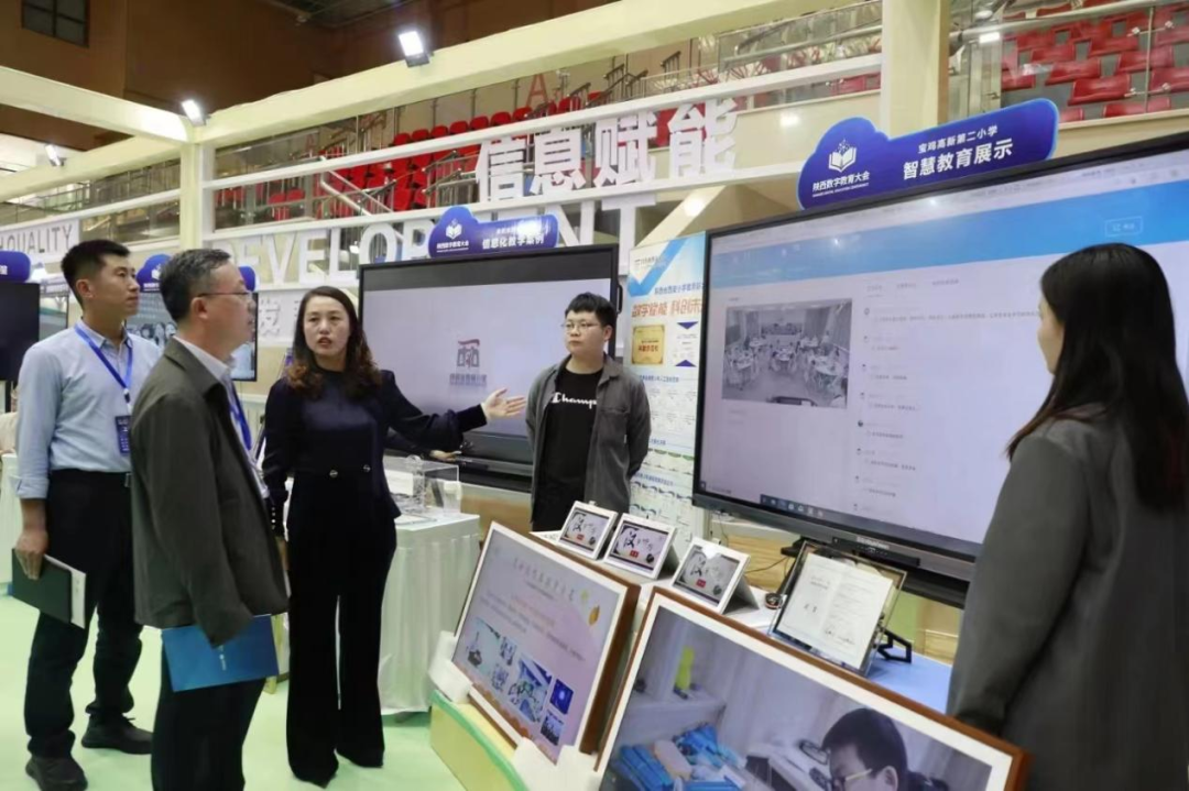 在大会现场,宝鸡高新三小通过线上线下全场景智慧课堂、数字驱动的智慧教研、全方位呵护学生身心健康的数字体育、全场景虚实结合五育评价、数字化教师成长管理、课题管理、教务管理的校园主动预警智能安防等常态应用案例实景展示,把现代数字教育融入教育教学的全过程。高新二小在会场进行了“智慧课堂”“智慧评价”“智慧教研”三个板块的展示。两所学校的精彩展示,吸引了众多参会专家、领导及各类学校同仁前来参观交流,并对宝鸡教育数字化发展赞不绝口,对宝鸡高新区智慧校园的体系化建设给予充分肯定和高度赞扬。