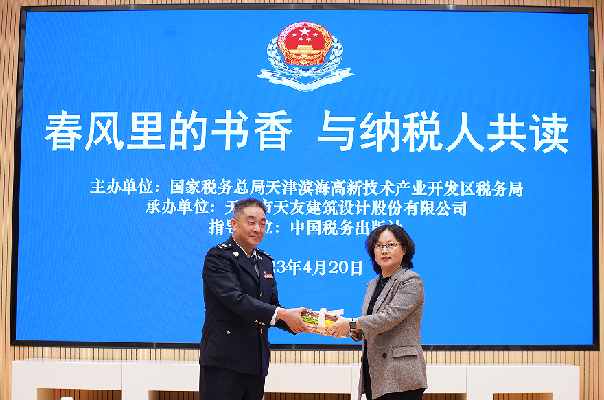 中国税务出版社为活动提供了图书支持,天津高新区税务局税务局相关负责同志作为代表,向天友设计赠送税务书籍。此外,高新区税务局业务骨干还带来了税惠“大礼包”,在活动现场为企业开展有针对性的政策答疑,就个人所得税专项附加扣除、企业研发费加计扣除、企业所得税汇总缴纳等政策做了详细介绍。