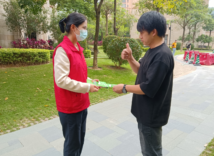 志愿者向居民派发文明典范城市创建传单时,获得市民点赞