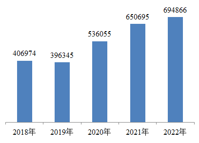 1.全国医疗器械不良事件报告数量。2022年,国家医疗器械不良事件监测信息系统共收到医疗器械不良事件报告694,866份,比上年增加6.79%(图1)。
