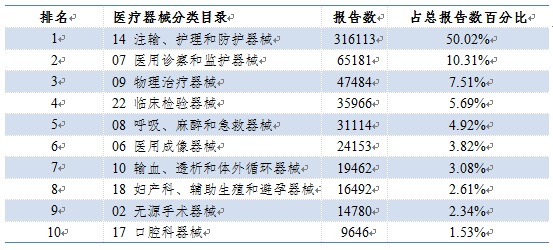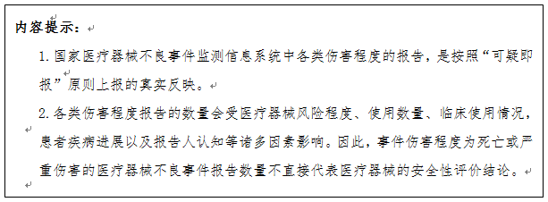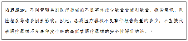 (二)不同医疗器械的不良事件报告数量受使用数量、风险程度、报告意识等诸多因素影响,因此报告数量的多少不直接代表医疗器械不良事件发生率的高低或者风险严重程度。