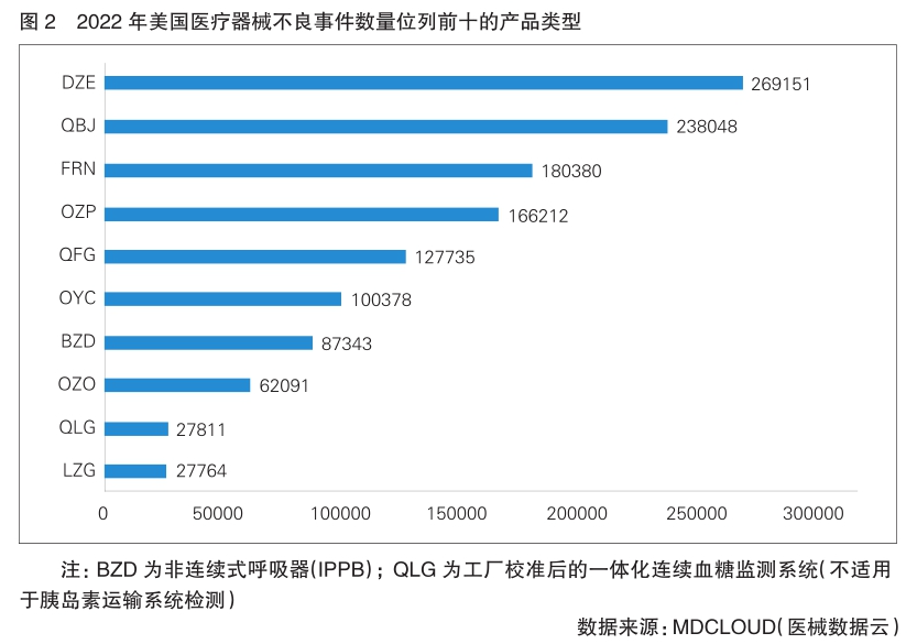 美国医疗器械产品分类代码对应的2022年不良事件数统计显示,2022年,报告医疗器械不良事件数量最多的单类产品为根管重塑牙内-骨内种植体(DZE),数量近27万起;其次为工厂校准式一体型连续血糖监控系统(QBJ)和输液泵(FRN)。位列不良事件数量前十的产品(详见图2)中,共有5类产品为胰岛素泵相关产品,分别为单激素控制自动胰岛素剂量泵(OZP)、备用控制器启用的胰岛素输注泵(QFG)、胰岛素泵(用于侵入性血糖传感器,OYC)、带阈值-暂停功能的自动胰岛素剂量泵(OZO)和胰岛素泵(LZG),共计报道了484180起。