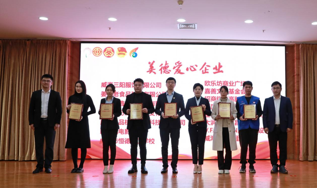 仪式上,威海高新区为三阳服饰等15家志愿服务项目“伙伴计划”企业颁发新时代文明实践“美德爱心企业”荣誉牌匾。17个志愿服务项目的实施团队与爱心企业上台结对,标志着高新区志愿服务项目“伙伴计划”正式启动。