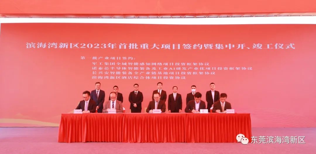 仪式上,东莞滨海湾新区与广东中天集团签署投资协议,与广东军工集团、深圳市诺泰芯半导体装备有限公司、北京长兴安科技发展有限公司三家企业签署投资框架协议,并与大湾区大学、东莞理工学院以及华为公司签署战略性合作协议。