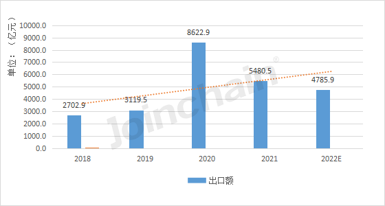图1 2018-2022年中国医疗器械出口贸易总额及增速