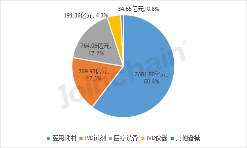 2022年1-11月期间,我国医用耗材出口额最高,达2681.8亿元,占医疗器械总出口额的60.4%;体外诊断试剂、医疗设备出口额分别为769.93亿元、764.06亿元,占比均为17%。