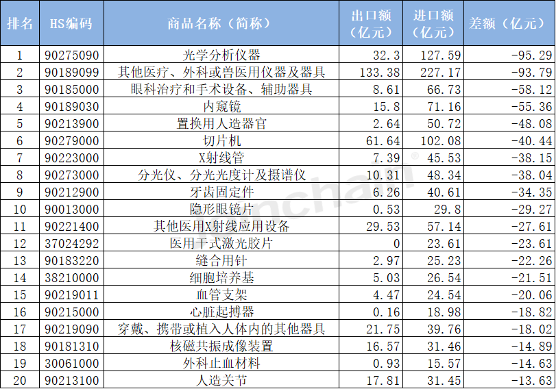 在医疗设备中,出口额较高的有彩超65.08亿元,X光发生器62.72亿元,切片机61.64亿元,医用病床56.90亿元。
